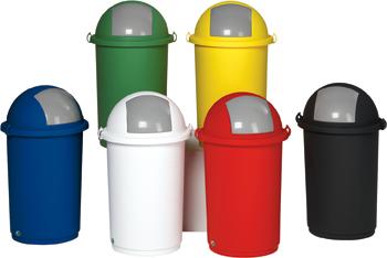 Diese Push-Abfallsammler sind robust. Sie haben ein abnehmbares Kunststoff-Kopfteil mit breiter Einwurfklappe.