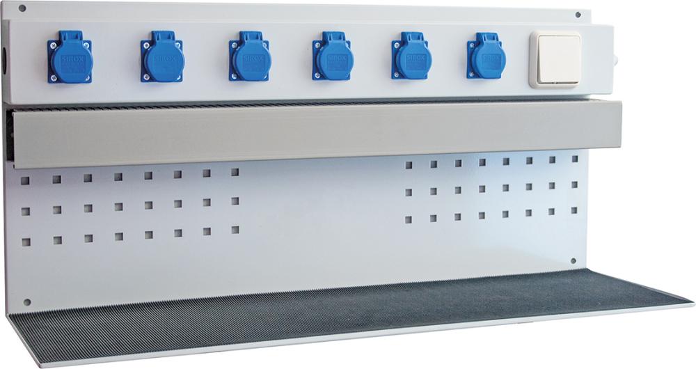 • 6x Einbausteckdosen 230V/50Hz (links), 1 x Ein/Ausschalter für die E-Leiste