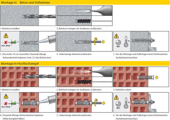 • Verbundmörtel mit ETA-Zulassung Option 1 für gerissenen Beton und ETA-Zulassung für Mauerwerk (Voll- und Lochsteine) sowie Feuerwiderstandsprüfung F120
