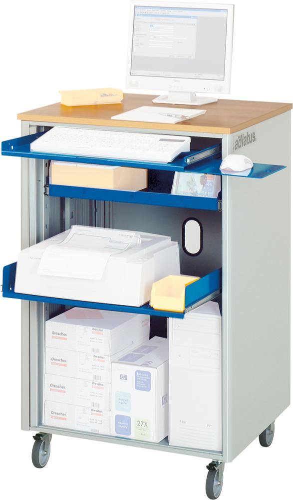 Diese Computer-Stationen gibt es in mobiler und stationärer Ausführung. Sie haben eine Werkbankplatte in Buche-Dekor.