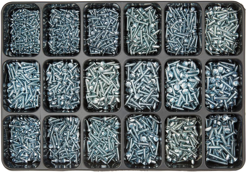 • 2530-teiliges Blechschrauben-Sortiment: Linsenkopf, Kreuzschlitz H, Form C mit Spitze, DIN 7981 und Linsensenkkopf, Kreuzschlitz H, DIN 7983