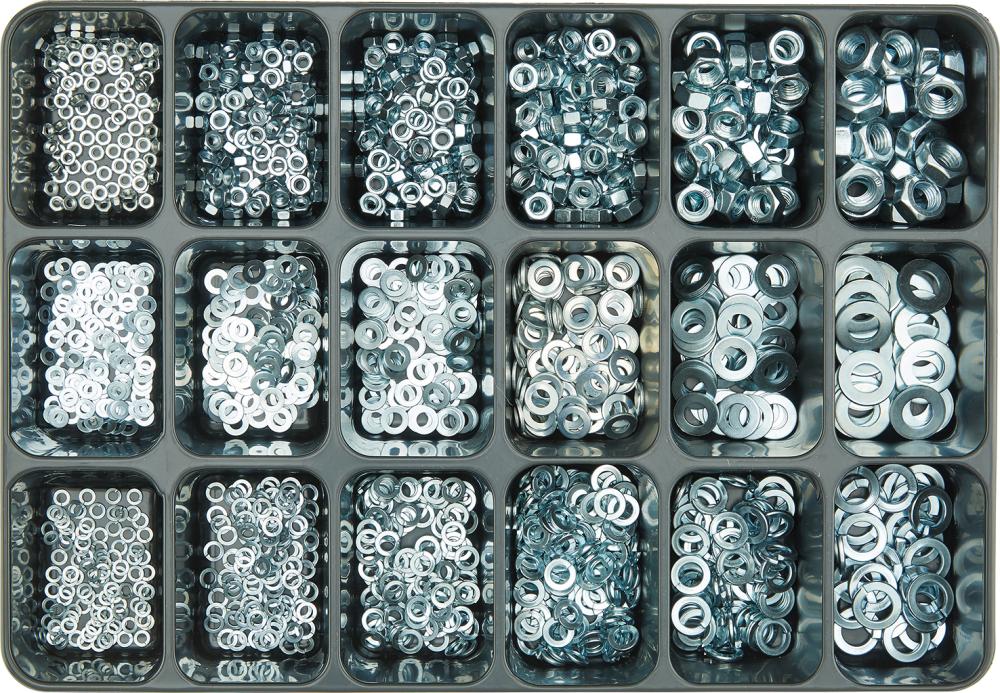 • 1425-teiliges Sortiment: Muttern, DIN 934; Scheiben, DIN 125; Federringe, DIN 127