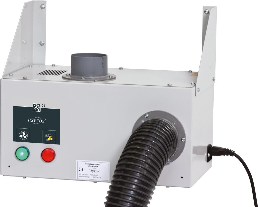 Dieser Entlüftungsaufsatz ist steckerfertig. Er lässt sich einfach und schnell montieren. Frei werdende Dämpfe und Gase werden an ihrer Austritts- und Entstehungsstelle sicher erfasst