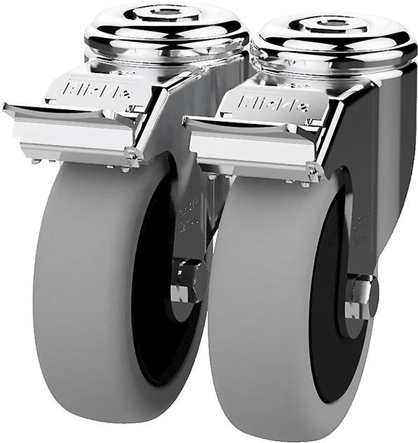 • 4 Lenkrollen, Ø 125 mm, 2 davon mit Feststeller, sowie ein Schiebegriff