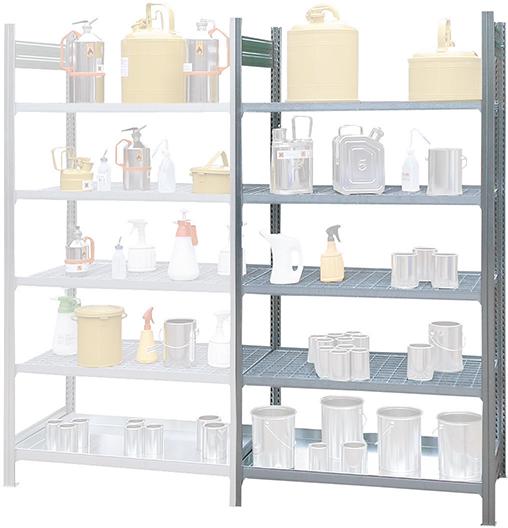 Ausstattung: Regal mit 1 Auffangwanne (entsprechend WHG) unten und 4 Gitterrostebenen