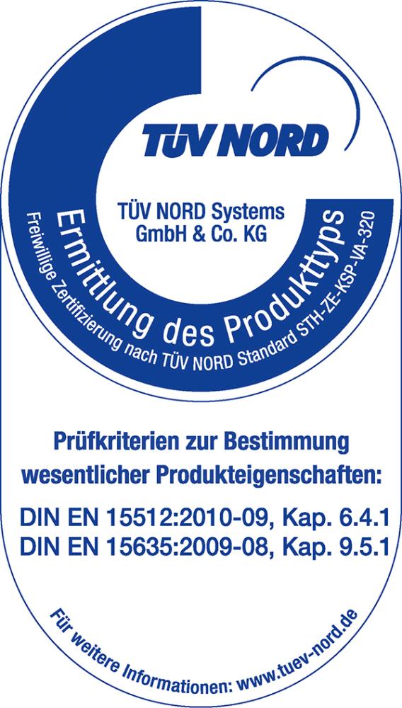Hinweis: TÜV-geprüft nach DIN EN 15512:2010-09,Kapitel 6.4.1 DIN EN 15635:2009-08,Kapitel 9.5.1. mit 400 Joule.