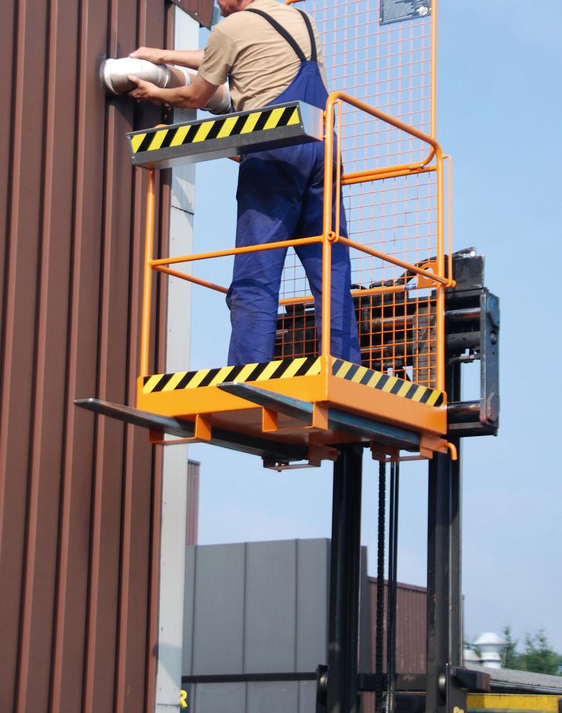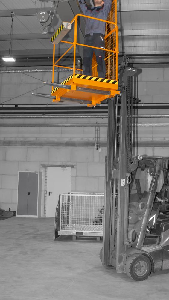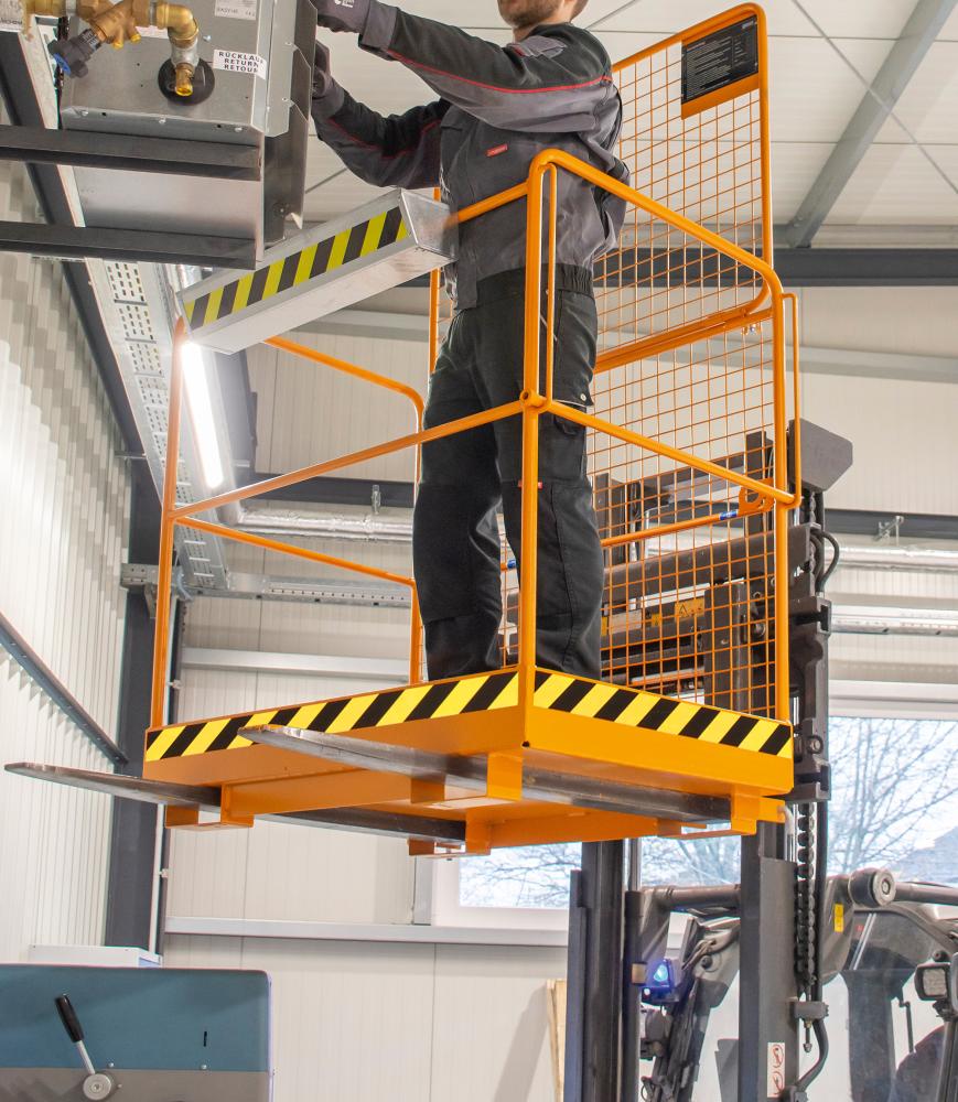 Dieser robuste Sicherheitskorb für Gabelstapler ermöglicht Reparatur- und Wartungsarbeiten  in großen Höhen.