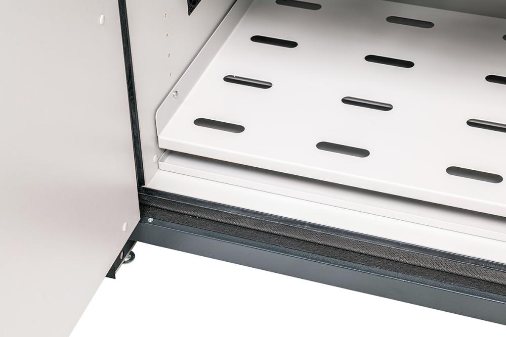 • Innenraumgestaltung: gelochte Fachböden aus pulverbeschichtetem Stahlblech, Tragkraft 25 kg (Schrankbreite 600 mm) oder 75 kg (Schrankbreite 1200 mm). Bodenauffangwanne.
