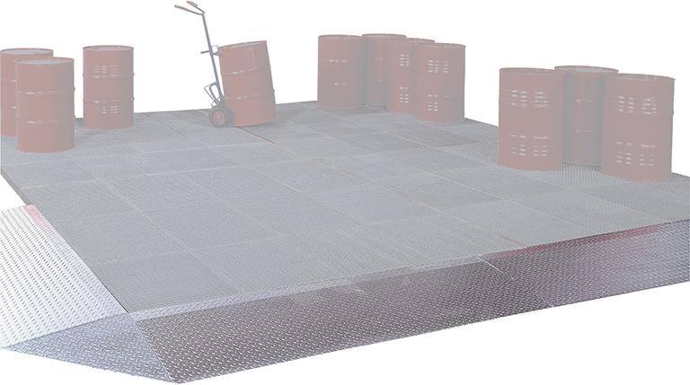 Die Sicherheits-Bodenelemente mit einer Höhe von nur 78 mm sind mit Hand-Gabelhubwagen und Stapelkarren problemlos befahren. Die Bodenelemente, Auffahrrampen und -ecken sind miteinander kombinierbar und für eine individuelle Raumauskleidung bestens geeignet. • Geeignet für die Lagerung wassergefährdender und entzündbarer Stoffe • Wanne aus 3-mm-Stahlblech, flüssigkeitsdicht verschweißt • Entsprechend WHG, Ü-Zeichen gemäß StawaR • Mit herausnehmbaren, hoch belastbaren, feuerverzinkten Gitterrosten • Befahrbar mit handgeführten Transportgeräten, auf Anfrage auch mit Stapler oder Lkw (Sonderausführung) • Beliebige Kombination der Einzelelemente möglich • Korrosionsschutz durch Verzinkung Anwendungsbereiche: • Leergutlager • Auslegung von Transportwegen • Revision von Transformatoren • Spritz- und Leckageschutz