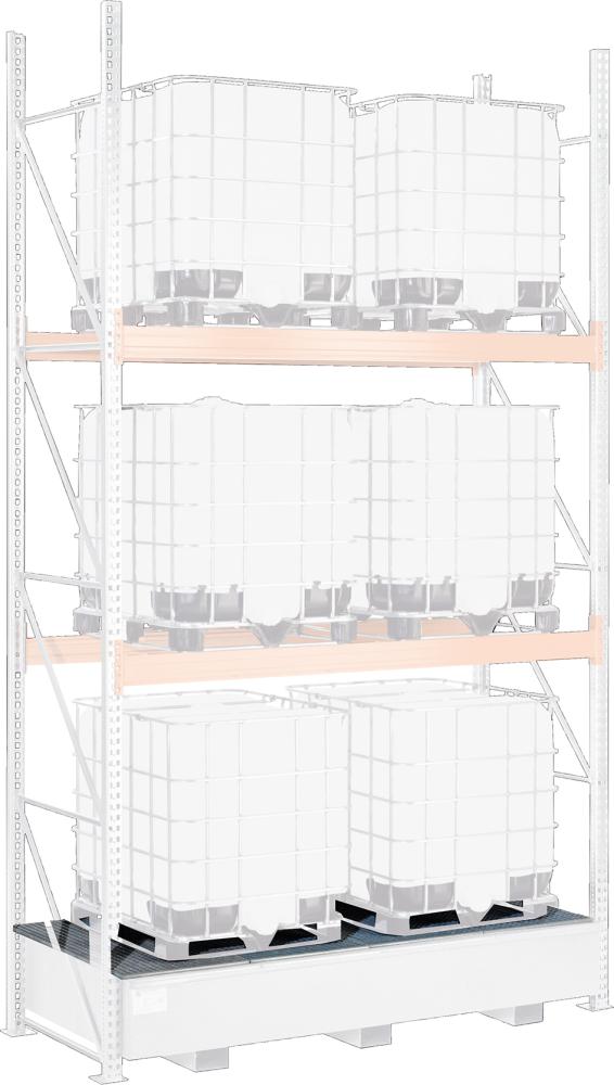 Diese Regale sind konzipiert für die Lagerung von Gefahrstoffen in KTC, IBC oder  Großbehältern. Das Lagersystem ist geeignet für:     •	Wassergefährdende Stoffe der GHS-Kategorie 1-4   •	Entzündbare Flüssigkeiten der GHS-Kategorie 1-3       Ausführung KTC-Regale:     •	Gütezeichen RAL-RG 614/2 Palettenregale, GS-Zeichen und DIBt-Zulassung   •	Hohenverstellbare Lagerebenen im Rasterabstand von 50 mm   •	Stützrahmen verzinkt, Längstraversen kunststoffbeschichtet RAL 2001 rotorange   •	Ständer bestehend aus kaltverformten Profilen, die bauseits mit der Ausfachung  verschraubt werden   •	Alle Traversenebenen sind mit optional bestellbaren Gitterrosten bestückbar