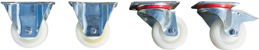 Dieser Rollensatz besteht aus 2 Lenk- und 2 Bockrollen aus Polyamid (1 Lenkrolle mit  Feststeller), Ø 100 mm.       •	Bauhöhe:  125 mm   •	 Tragfähigkeit max: 1050 kg