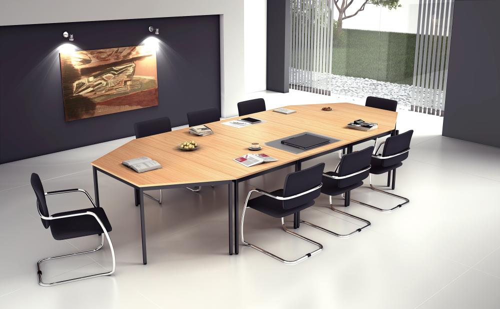 • Tischplatte: melaminharzbeschichtete E1-Spanplatte, 19 mm dick, mit 2 mm ABS-Kante, gerundet • Stahlrohrgestell: Rahmen verschweißt, 40 x 25 mm • Füße: 25 x 25 mm, schwarz pulverbeschichtet, mit Höhenstellschraube Lieferung: Zerlegt, einfache Montage. Hinweis: Kombination von Quadrat-, Rechteck- und Trapeztischen möglich.