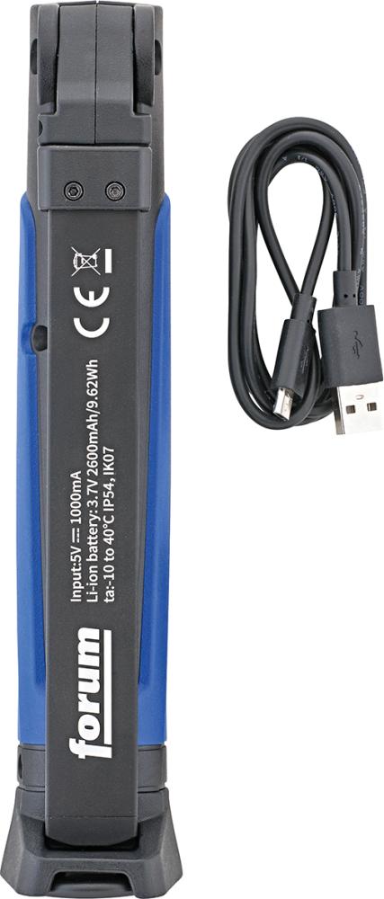 •	Hauptlicht fest verbaute COB-LED   •	Punktlicht fest verbaute SMD-LED   •	Leuchtstärke stufenlos (100–10 %) einstellbar   •	Gummiertes ABS-Kunststoffgehäuse   •	Magnetfuß und ausklappbarer Haken zur Befestigung   •	Kopf stufenlos schwenkbar   •	Schutzart IP54, Einsatz im Innen- und Außenbereich   •	Betrieb über fest verbauten Li-Ion-Akku 3,7 V/2600 mAh     Lieferung: Inklusive USB-Ladekabel.
