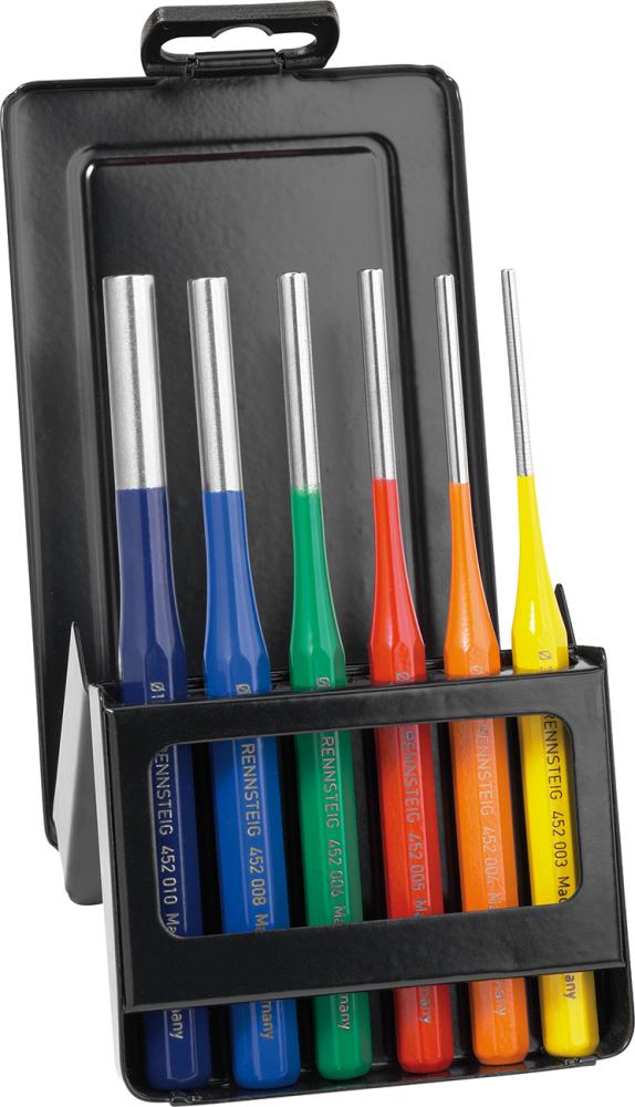 •	Schaft 8-kant   •	Zylindrische Dornform   •	Werkzeugstahl, extrahart (59 HRC)   •	Arbeitsende mit Sicherheitsschlagkopf   •	Unterschiedliche Farben erleichtern die Zuordnung der Durchmesser     Lieferung: In Metallkassette.     Inhalt: 6 Splintentreiber 3; 4; 5; 6; 8; 10 mm.