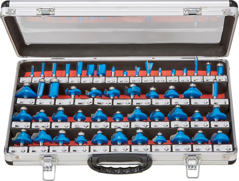 •	Teilweise mit Anlaufkugellager   •	Schaft 8 mm     Lieferung: In Aluminiumkassette mit durchsichtigem Deckel.     Inhalt:   3 Abrundfräser 6,35; 9,53; 12,7 mm   1 Ausstechfräser 6,35 mm   5 Bündigfräser 2 x 9,53; 2 x 12,7; 19,05 mm   4 Falzfräser 6,35; 7,94; 9,53; 12,7 mm   4 Fasenfräser 9,53; 12,7; 15,88; 19,05 mm   2 Gratfräser 12,7; 14,29 mm   3 Halbhohlkehlfräser 6,35; 9,53; 12,7 mm   3 Hohlkehlfräser 6,35; 9,53; 12,7 mm   7 Nutfräser 4,76; 6,35; 7,94; 9,53; 12,7; 15,88; 19,05 mm   13 Profilfräser 3,18; 3,97; 5 x 4,76; 5,56; 3 x 6,35; 7,14; 7,94 mm   3 Viertelstabfräser 6,35; 9,53; 12,7 mm   2 V-Nutfräser 9,53; 12,7 mm