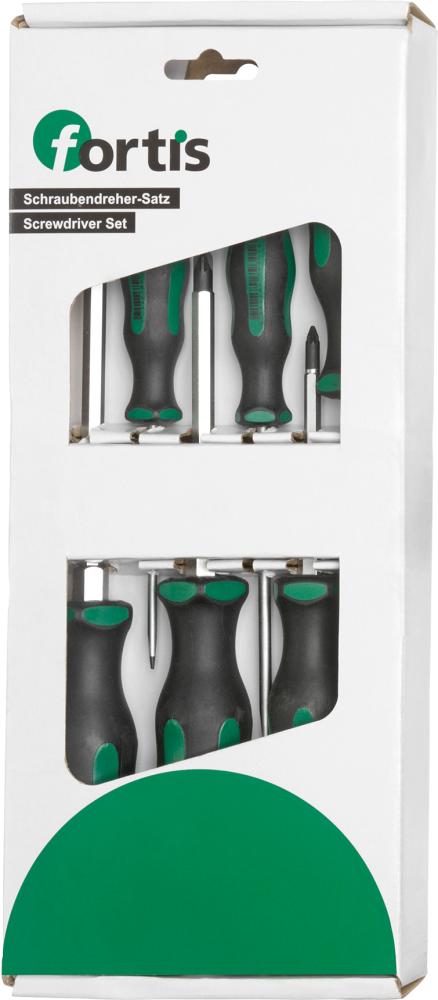 Für Schlitz-/Kreuzschlitz-Schrauben PH   •	6-kant-Klinge, durchgehend   •	Schlagkappe   •	Verchromt   •	Chrom-Vanadium-Stahl   •	Mehrkomponenten-Kunststoffgriff   •	Abrollschutz     Lieferung: Im Fensterkarton.     Inhalt:   4 Schraubendreher für Schlitz-Schrauben 3*; 4*; 5,5; 6,5 mm   2 Schraubendreher für Kreuzschlitz-Schrauben PH 1; PH 2     * Mit runder, nicht durchgehender Klinge.