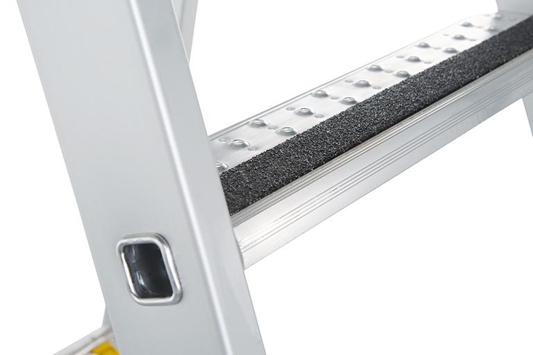 Diese beidseitig begehbare Leiter verfügt über rutschsichere Stufen für den Einsatz in öligen oder nassen Bereichen.
