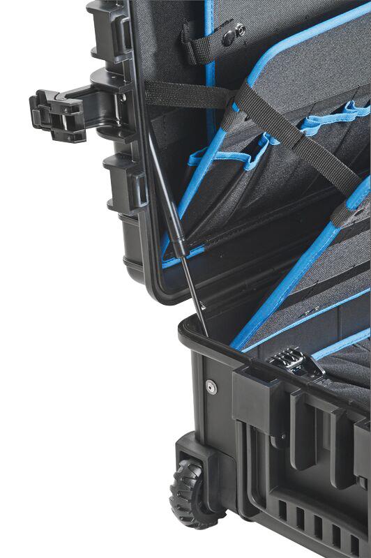 •	2 herausnehmbare Werkzeugtafeln mit Einsteckfächern im Deckel