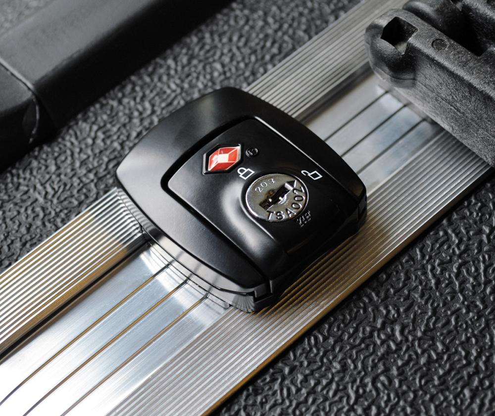 Hinweis: TSA-Schlösser können am Flughafen mit einem Generalschlüssel geöffnet werden, dies  verhindert ein gewaltsames Öffnen bei der Zollabfertigung.